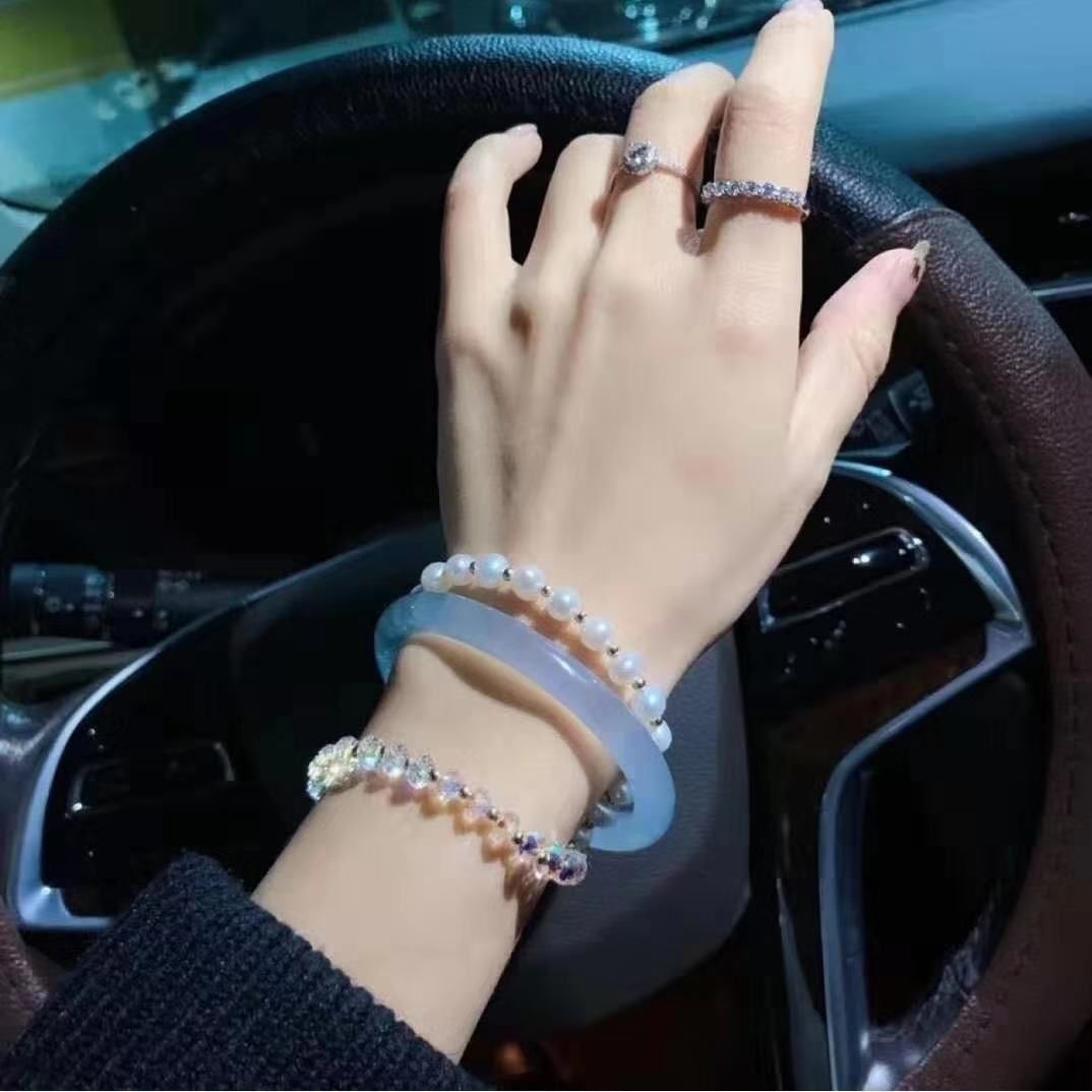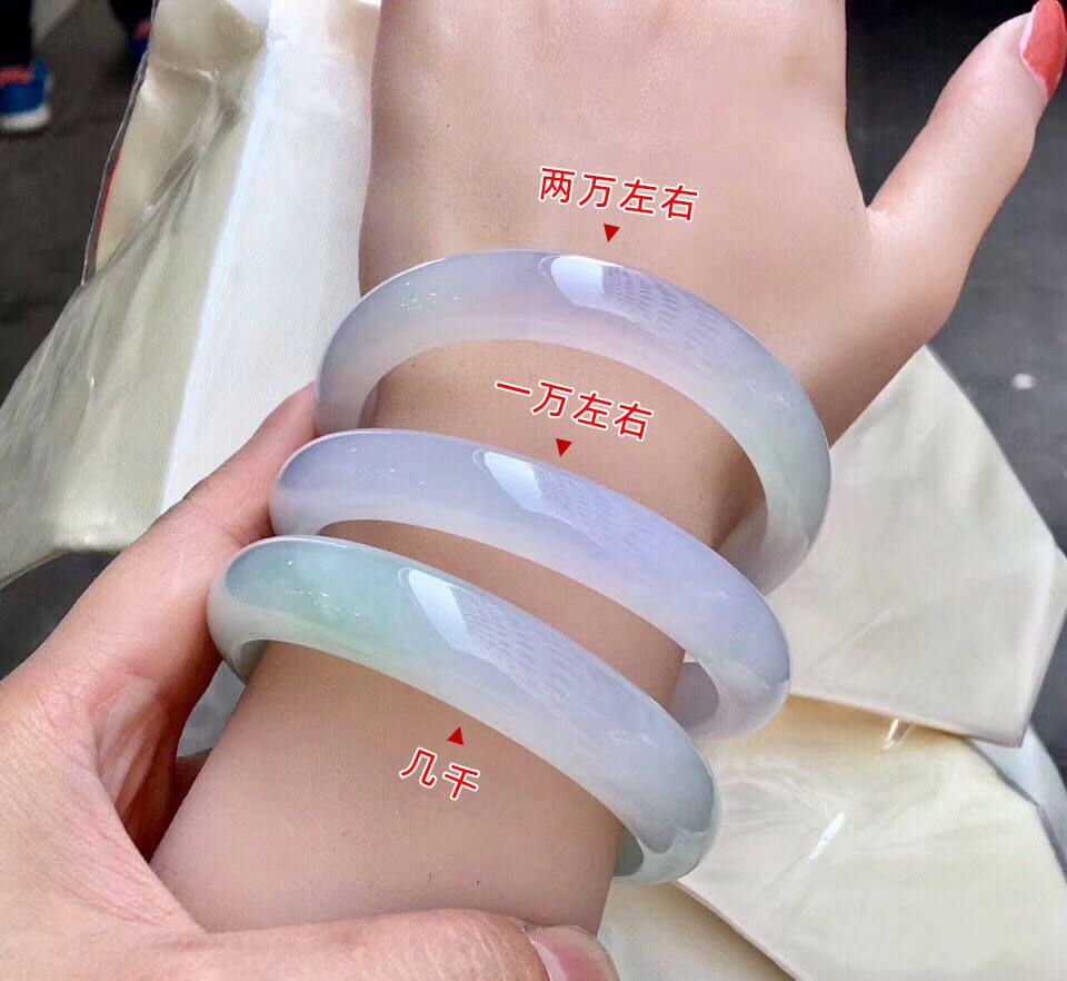 下面这三个手镯,都是水润清透且有底色,都好看,但是最下面的相对来说内部棉理结构多了一点,中间的跟上面的一块料下来,都是冰春彩,不过中间的光泽程度不及上面的,所以价格从上到下就是两万左右、一万左右、几千。