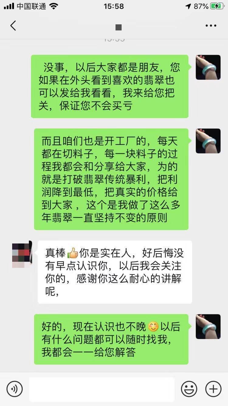 这里肯定就有人要叫了,那我买的这些玉得有多贵!多么不划算!但是你想,你喝的牛奶,是否直接到从奶牛到你嘴巴里面?从养殖牛开始,到规模化生产,到广告 投放到品牌效益,中间的博弈,我能看到这个价,才有这次交易,不管中间多少次加价,最后流通到市面上是一线交易市场合理的价格,比别人的高了,你卖不出, 自然不会买,或者你得亏本卖,靠忽悠卖高价蒙傻瓜的方式一年你能蒙到一两个算你运气好,特别是现在网络销售价格如此透明的情况下,而且按照我经验,越外行 越乱还价,几万的能给你出300,气得你翻白眼!对翡翠感兴趣可添加我微信:点击复制添加